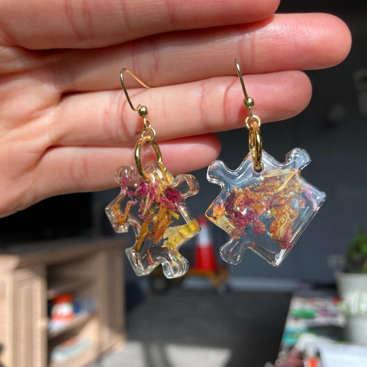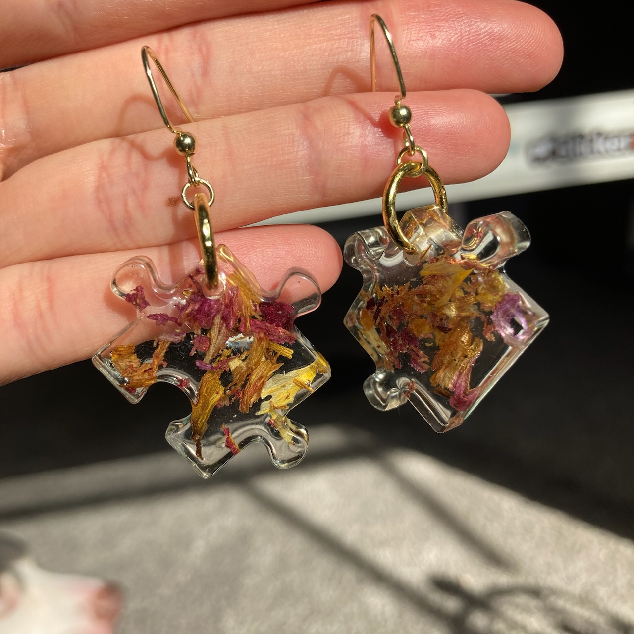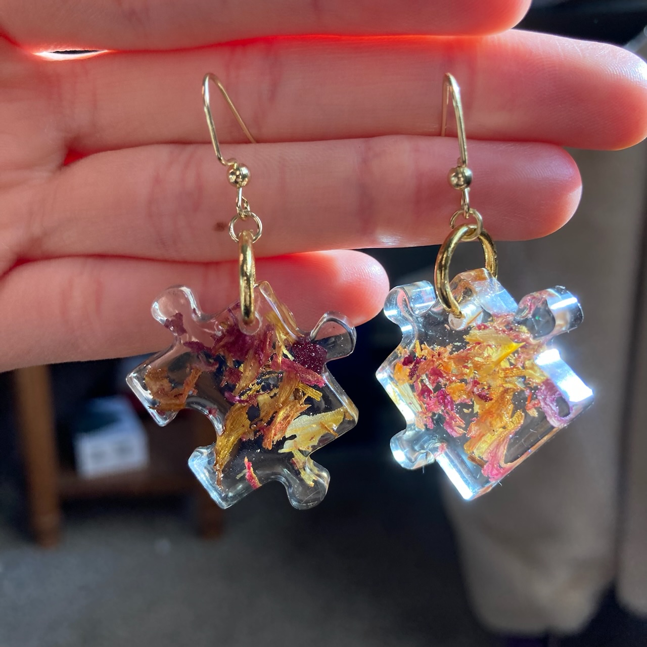 Resin Puzzle Earrings with pressed flowers inside ! Each pair is unique